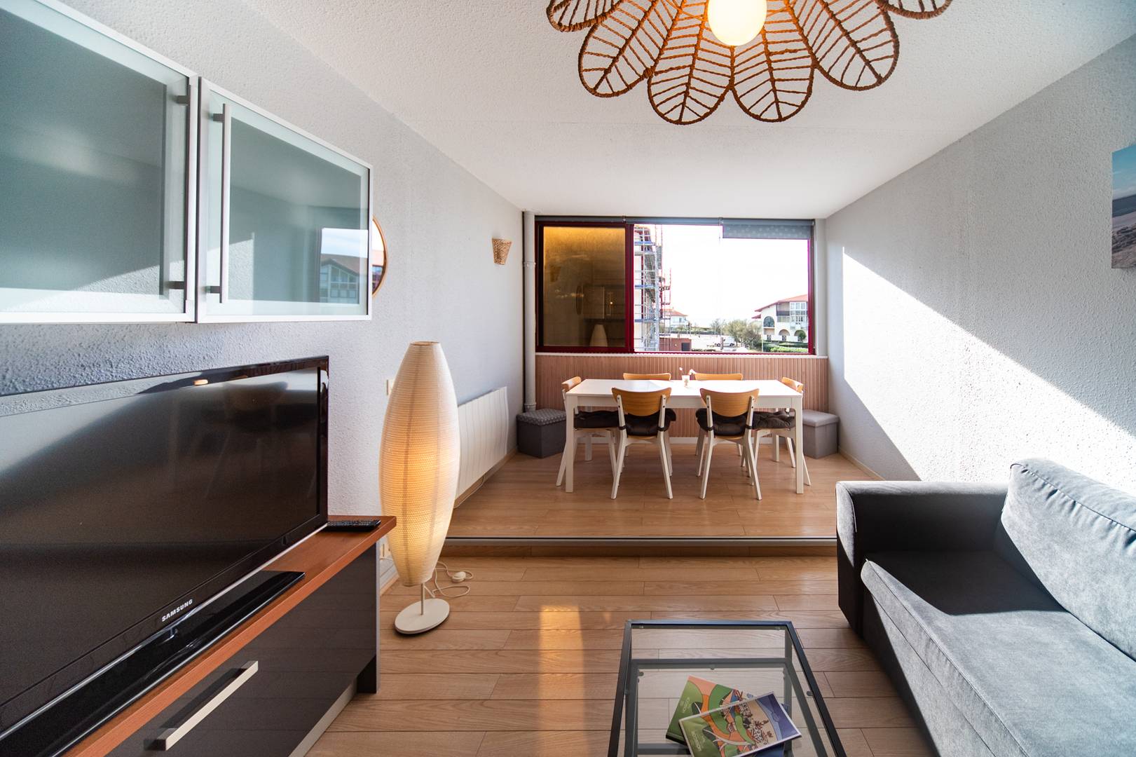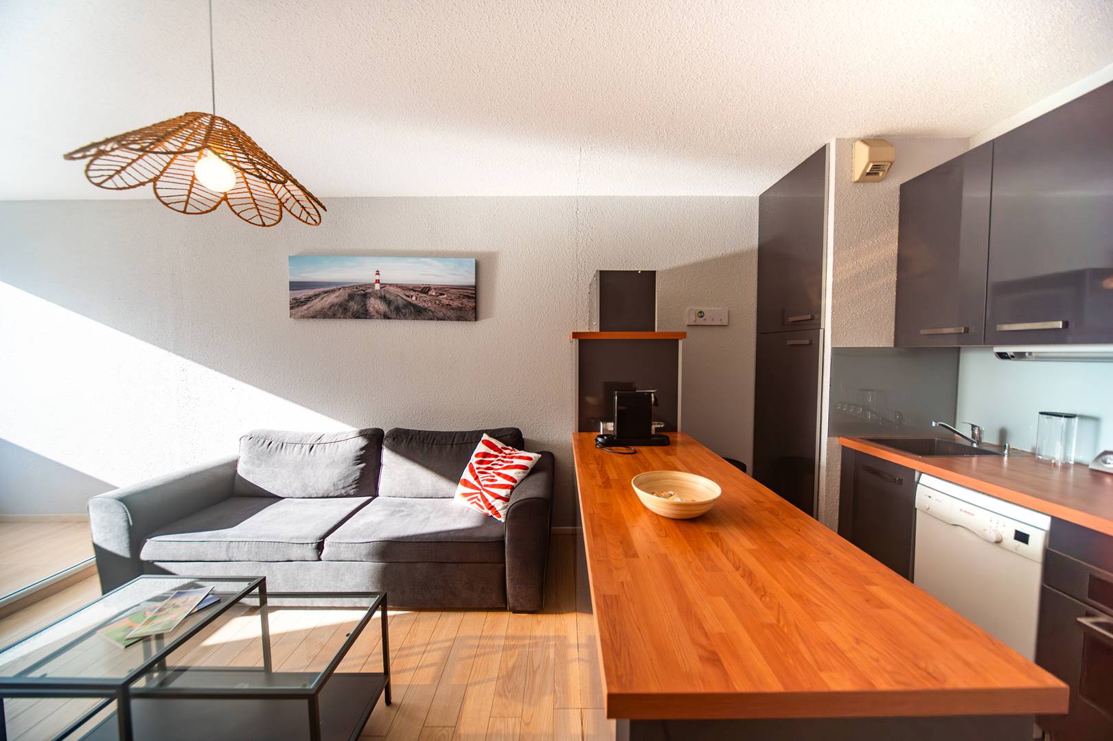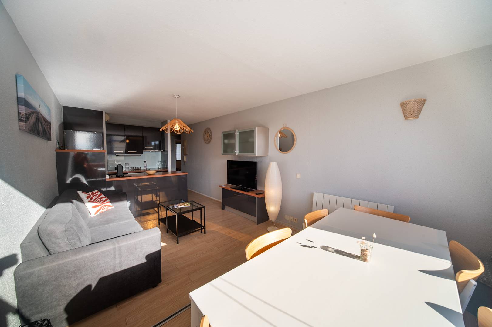 L’appartement comprend une entrée puis un séjour lumineux avec cuisine ouverte moderne entièrement équipée (plaque vitrocéramique, four, lave-vaisselle, lave-linge, réfrigérateur et micro-ondes). Avoir annexé le balcon pour en faire un coin repas offre un séjour-salon avec un beau volume.