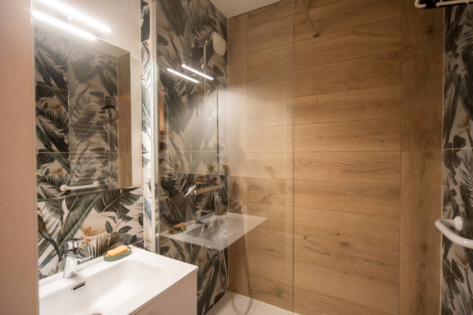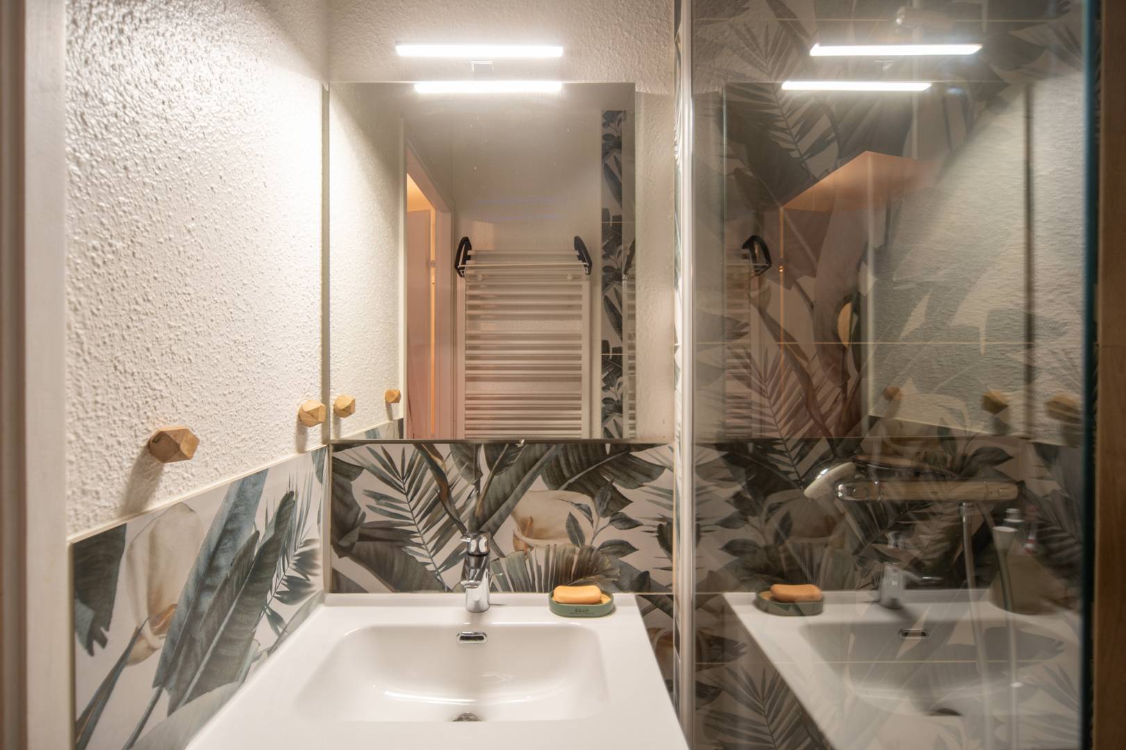 La salle de douche est aménagée avec une douche à l’italienne, meuble vasque avec rangements et sèche-serviettes. Les toilettes sont indépendantes.