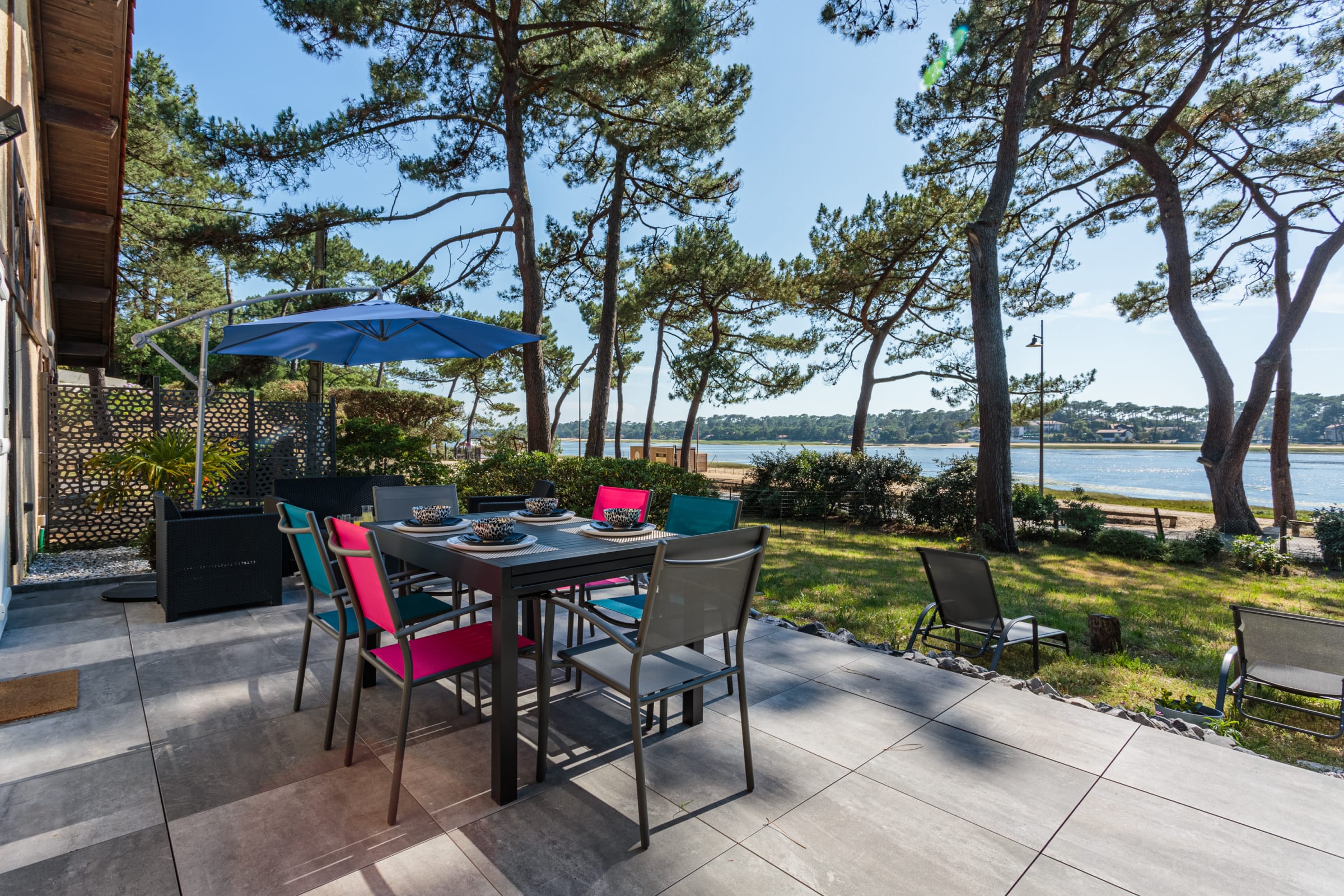 - une belle terrasse de 30 m² avec coin détente et coin repas, sur un jardin de 230 m² donnant sur le lac,